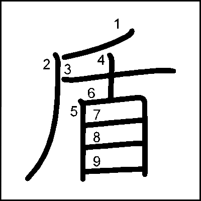 盾の書き順・筆順 漢字 2022.08.18 盾の書き順をまとめました。 スポンサーリンク 目次 盾の書き順・筆順盾の書き順盾の読み方・画数・部首 盾の書き順・筆順 盾の書き順 盾の読み方・画数・部首 文字 盾 読み方 ・ジュン・たて 部首 目 画数 9