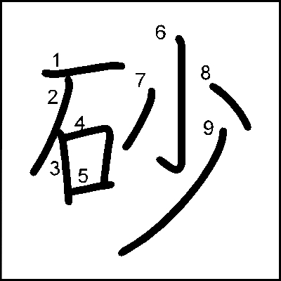 砂の書き順・筆順 砂の書き順をまとめました。 目次 砂の書き順・筆順砂の書き順砂の読み方・画数・部首 砂の書き順・筆順 砂の書き順 砂の読み方・画数・部首 文字 砂 読み方 ・サ・シャ・すな 部首 石 画数 9